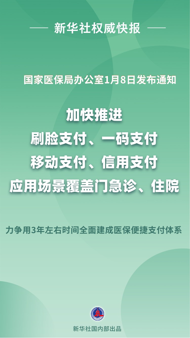 聚焦群众看病缴费“多次排队”“排长队”等堵点痛点,国家医保局办公室1月8日发布《关于大力推进刷脸支付、一码支付、移动支付、信用支付等便捷支付工作的通知》,明确加快推进刷脸支付、一码支付、移动支付、信用支付在各类医疗场景落地,力争用3年左右时间全面建成医保便捷支付体系。